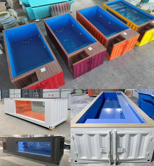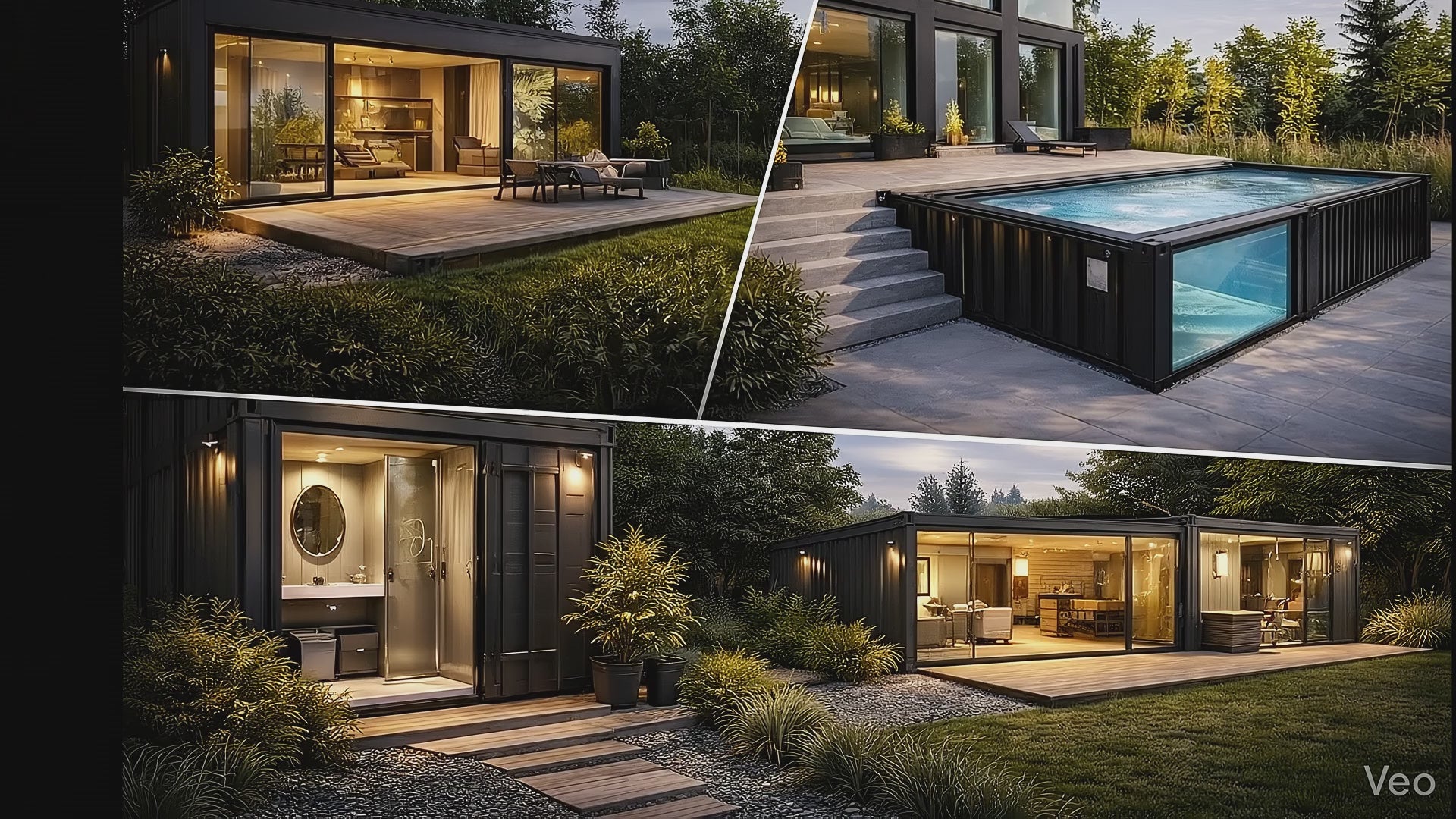Containerpool mit Glasfenster, erweiterbare Häuser & Sanitärcontainer – individuell konfigurierbar.